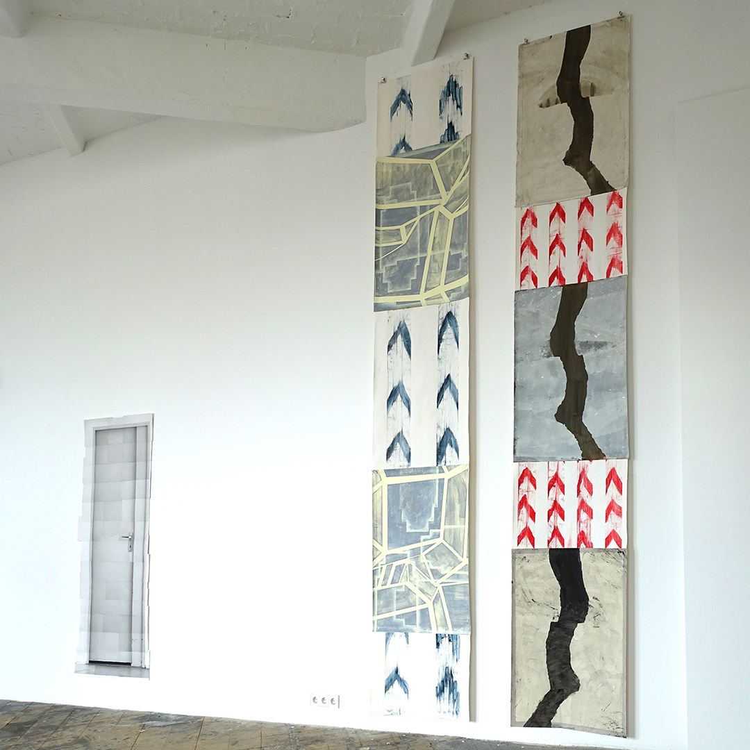 Muster der Moderne, 2023, variable Bildbahnen, je 400 x 70 cm,links „Türe I oqbo“ von Frank Eltner