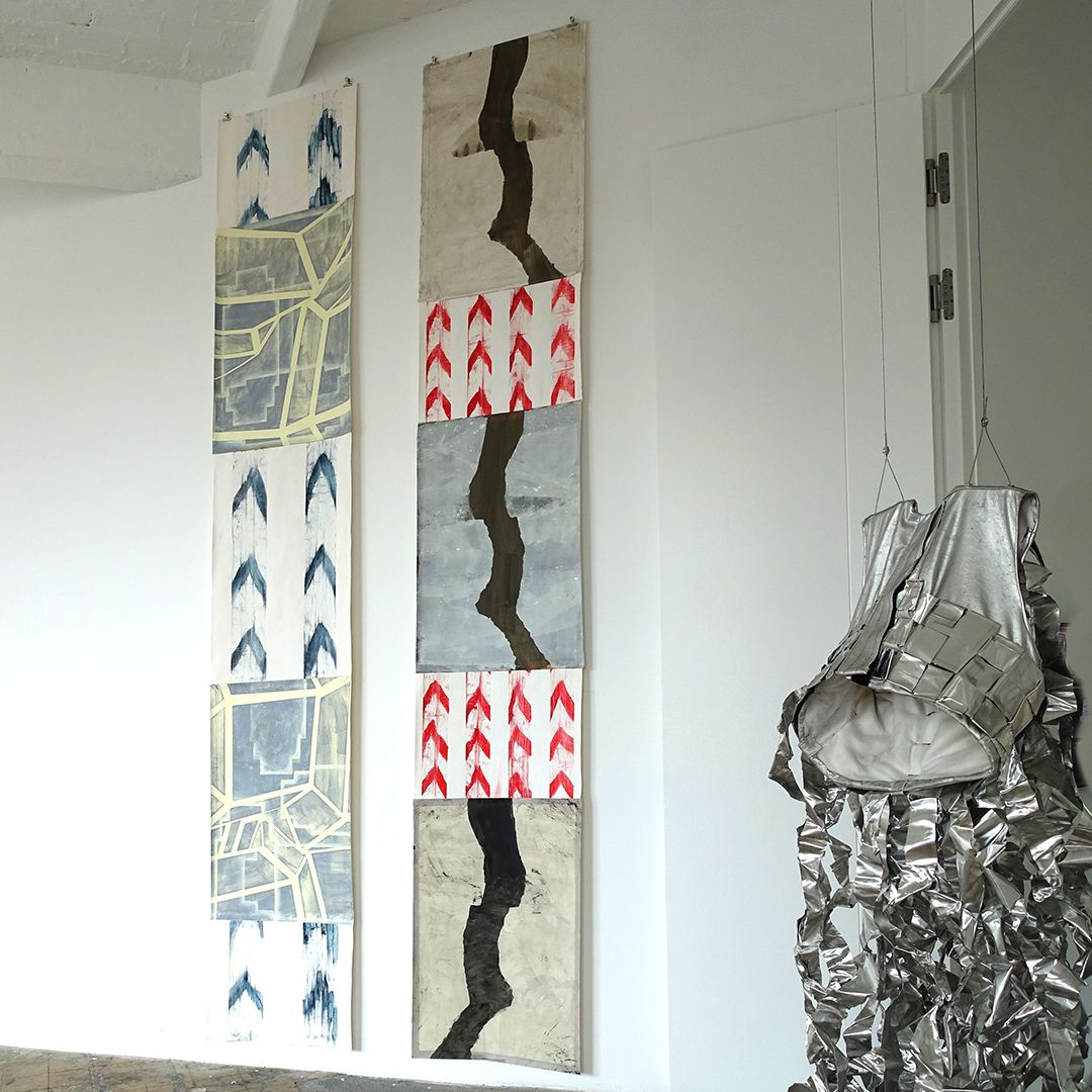 Muster der Moderne, 2023, variable Bildbahnen, je 400 x 70 cm, „décibelle, Soundkleid für stille Straßen“, Seraphina Lenz