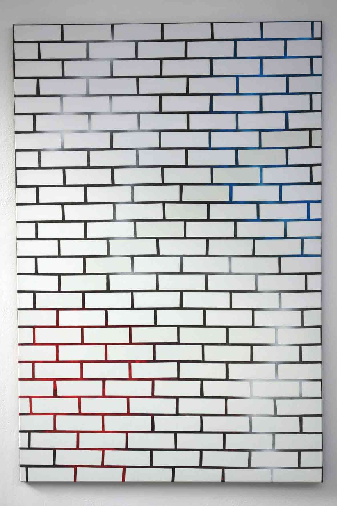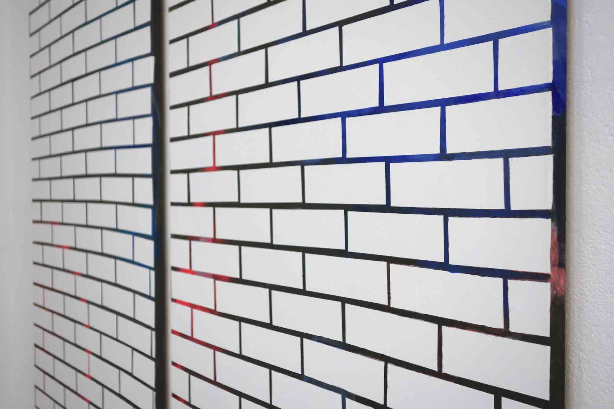 Wandbilder, Bilder von den Wänden eines S-Bahnaufgangs, in Originalgröße gemalt. Farbspuren in den Fugen der weiß gefliesten Fläche zeugen davon, dass sich bunte Graffiti dem Abwasch widersetzte. Sie schieben die Erzählebene ein, fügen dem je nach Sichtweise abstrakten oder gegenständlichen Thema die Zeit und die Handlung hinzu.