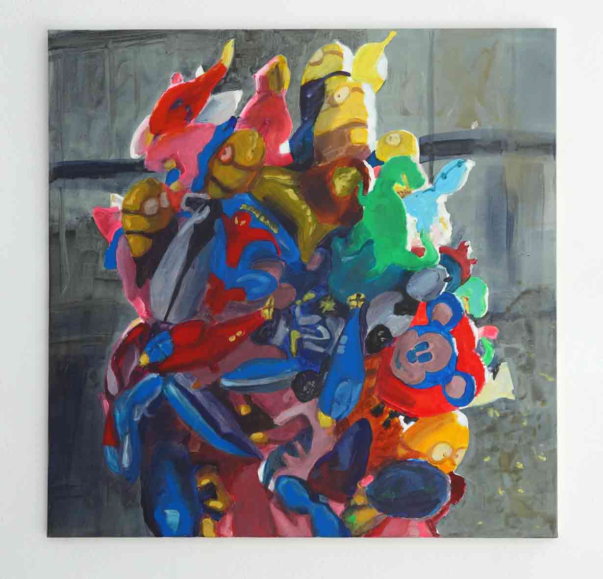 Die parallel entstandene Bildreihe "Minions" zeigt Spiderman, aufgeblasen neben Mickey schwebend. Drachen drängeln sich an Einhörner, ein Pinguin steht auf einem Pferd. Sie treten hervor aus einem Knäuel von Farben und sind ebenfalls nicht erfunden. Die flüchtige Begegnung schematisierter Geschöpfe erzeugt wahre Muster.