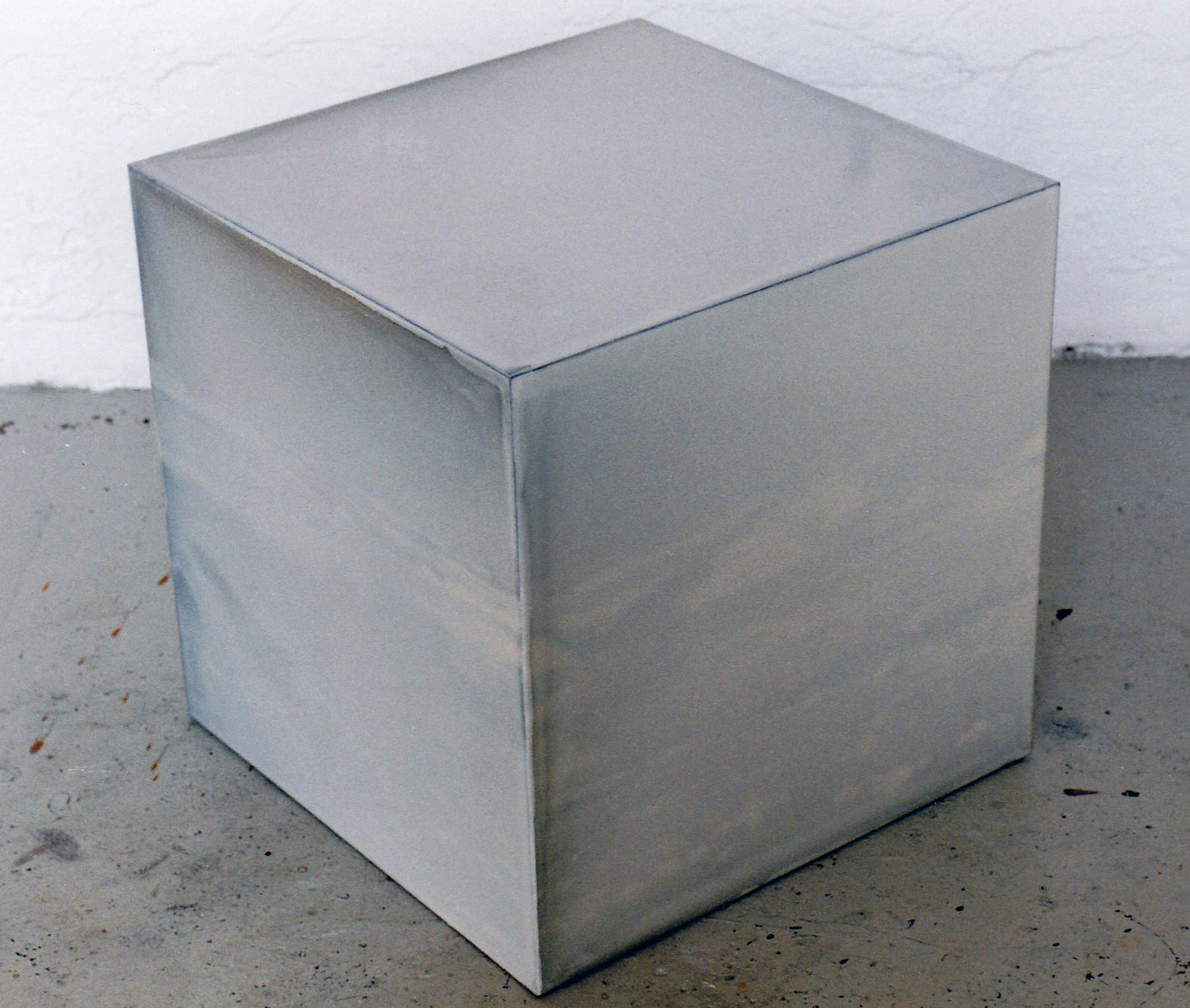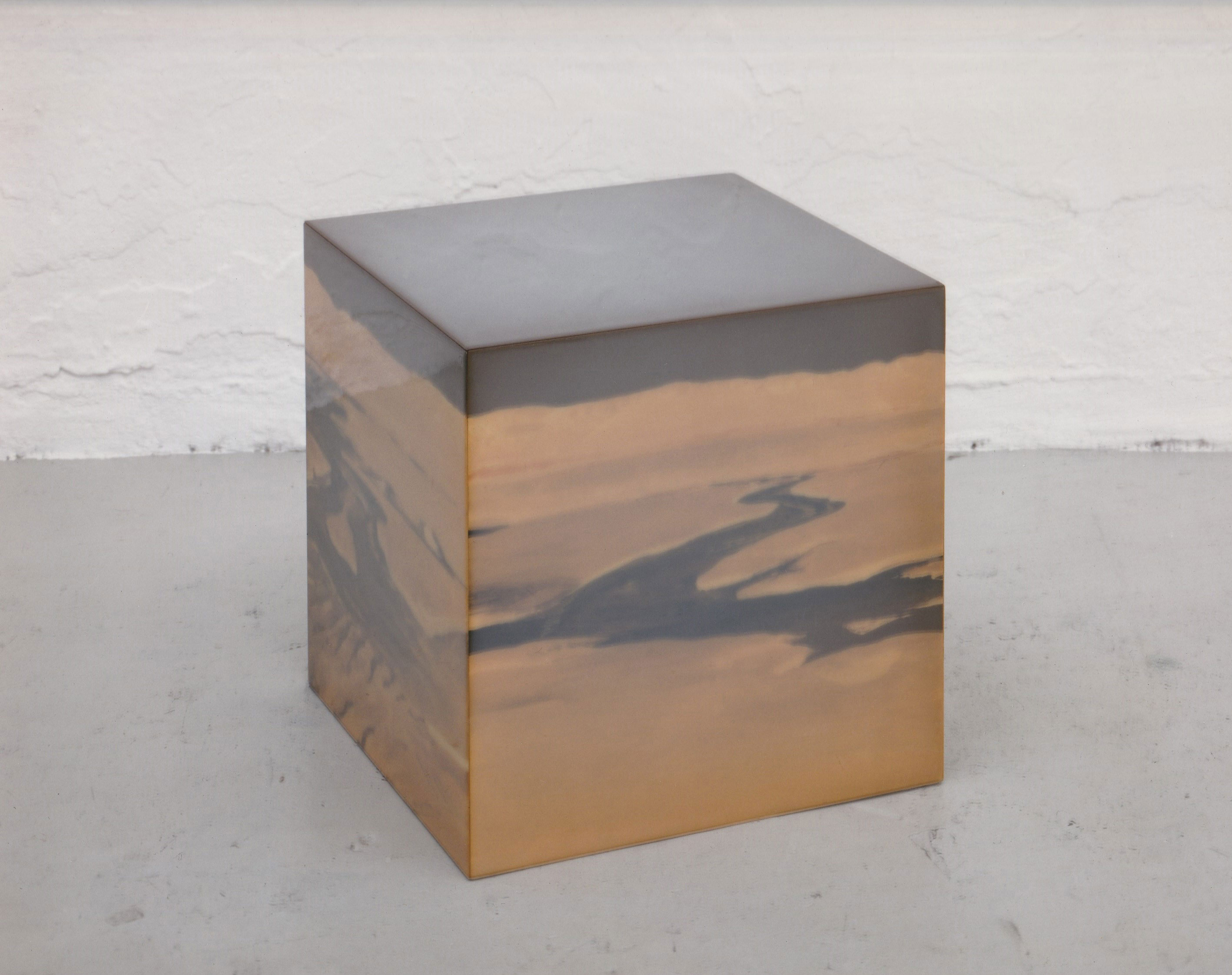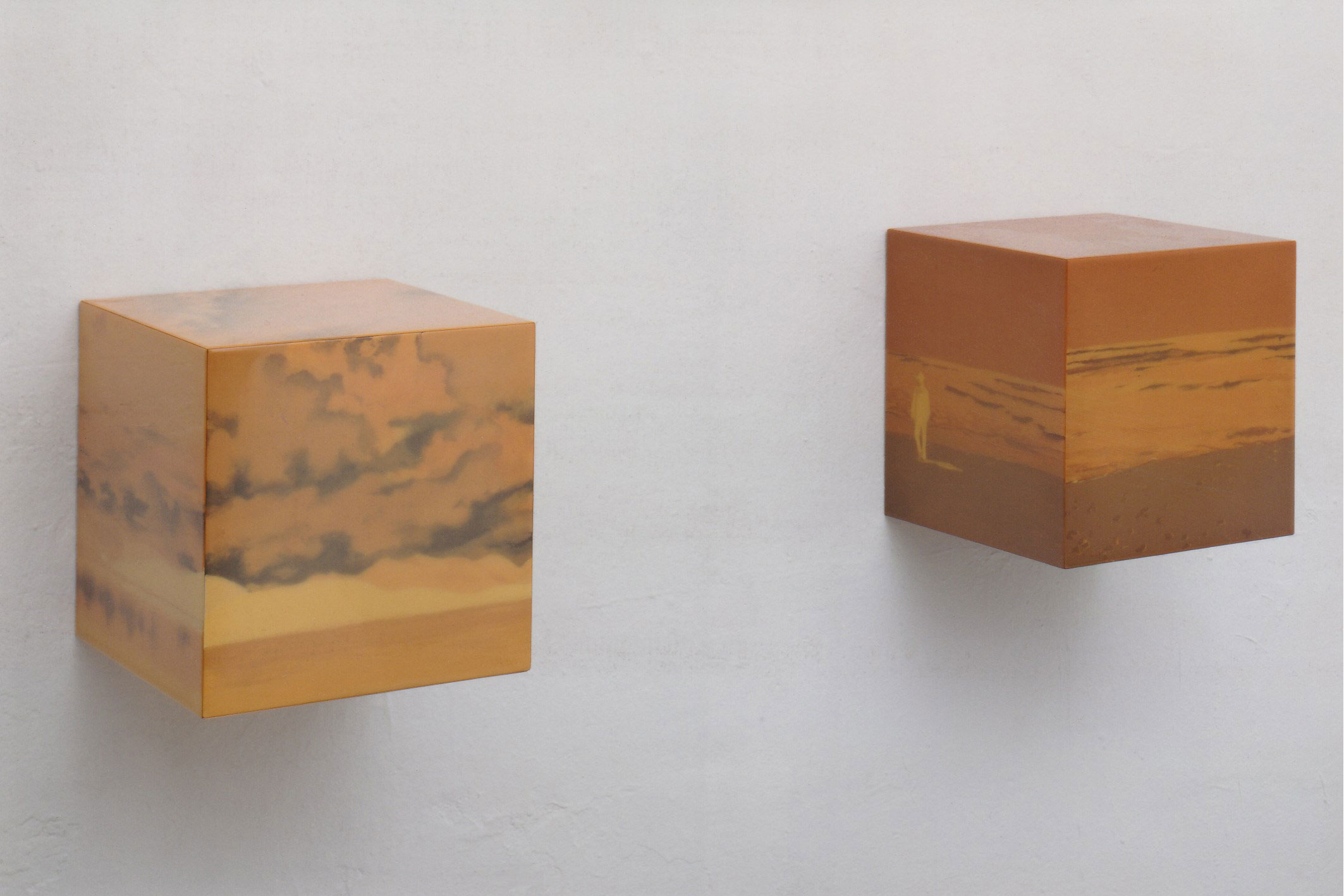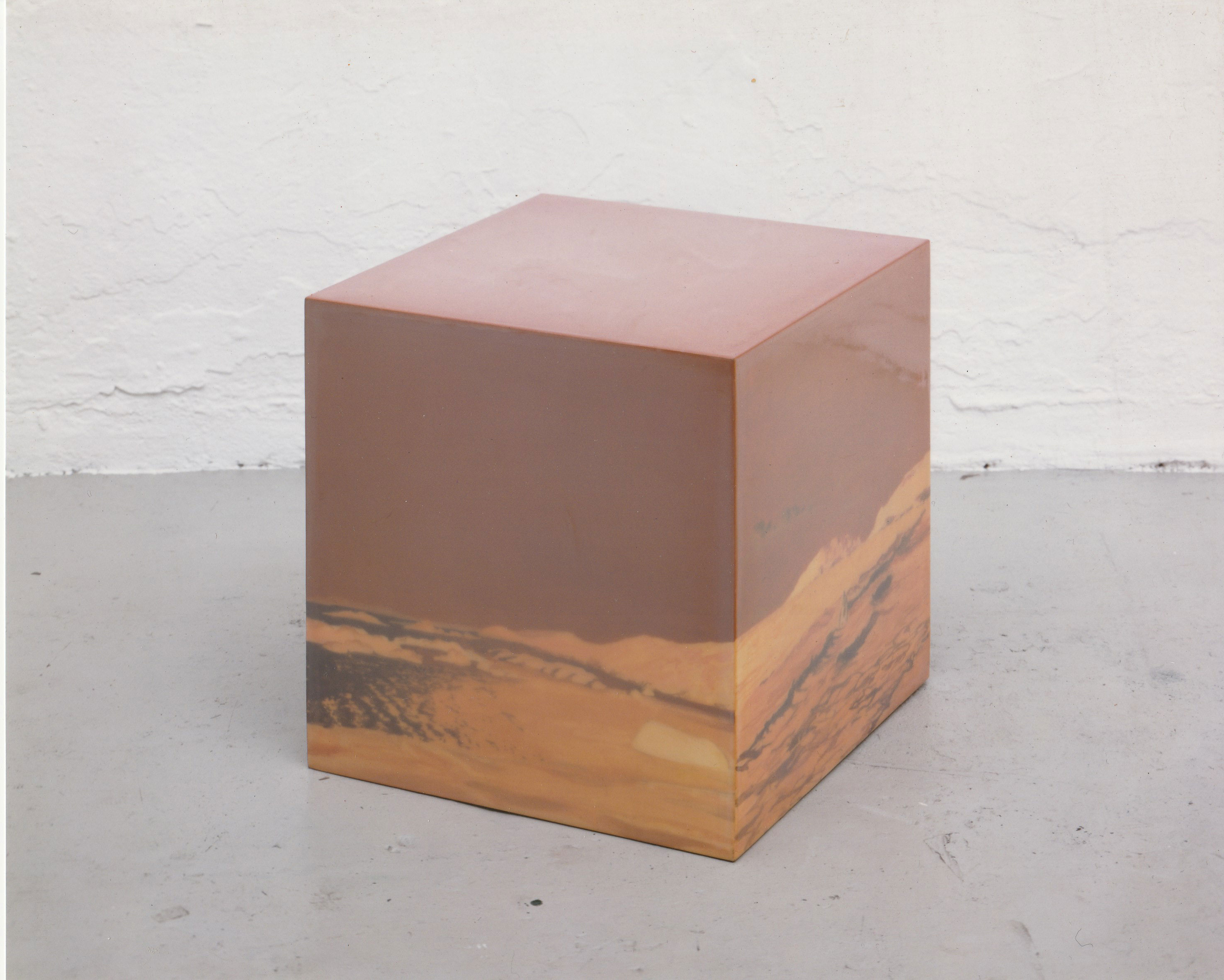 Fünf Bildflächen mit Landschaftsmotiven sind zu einem Würfel montiert. Die Tiefe des gemalten Raumes steht im Gegensatz zur Geschlossenheit und Unzugänglichkeit des Objekts. Es ist umgehbar, aber nicht betretbar. Der Titel verweist auf die Vorstellung einer komprimierten Ausdehnung. Aus der Nähe betrachtet tritt der Körper zurück, und es öffnen sich bildhafte Perspektiven.