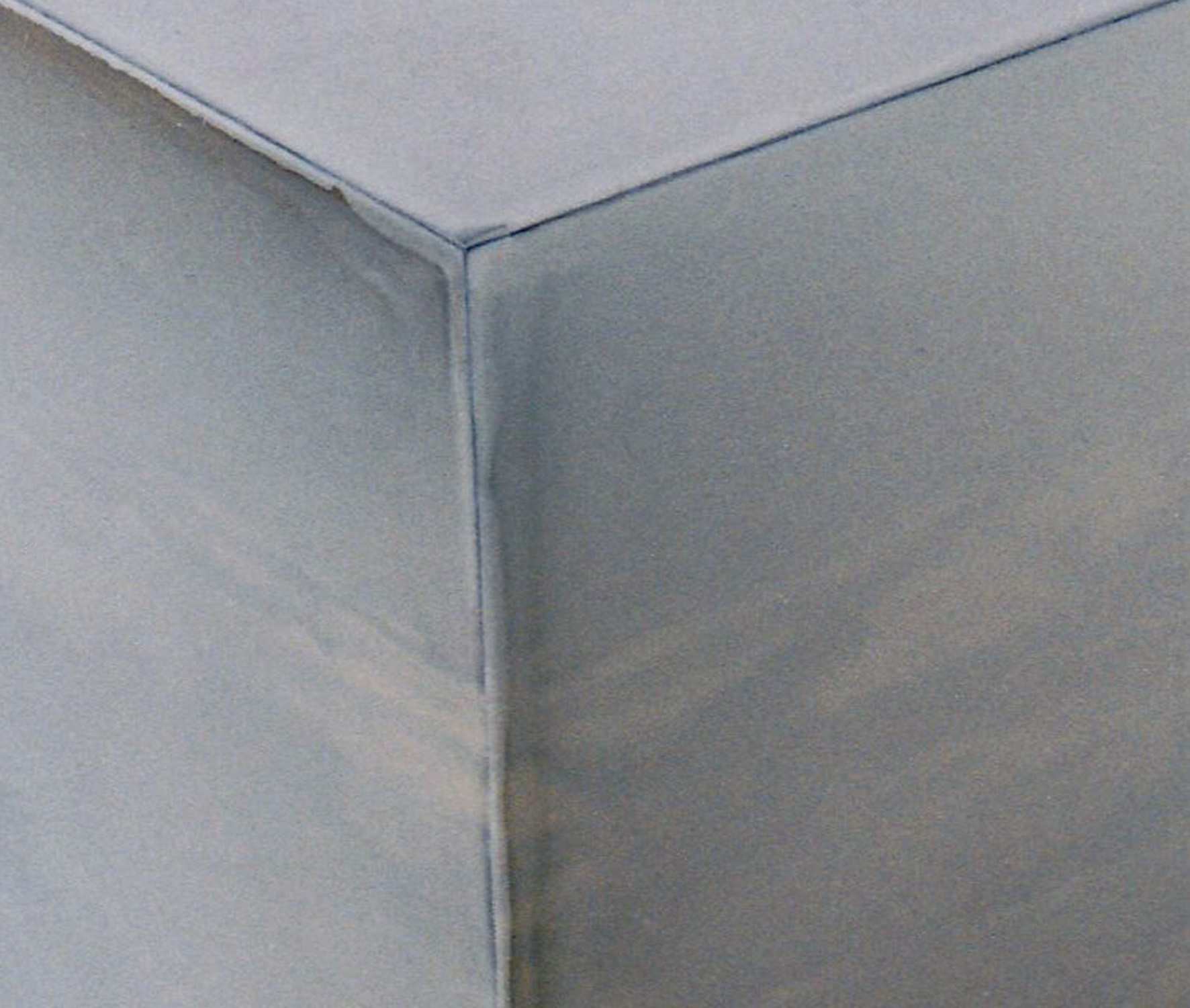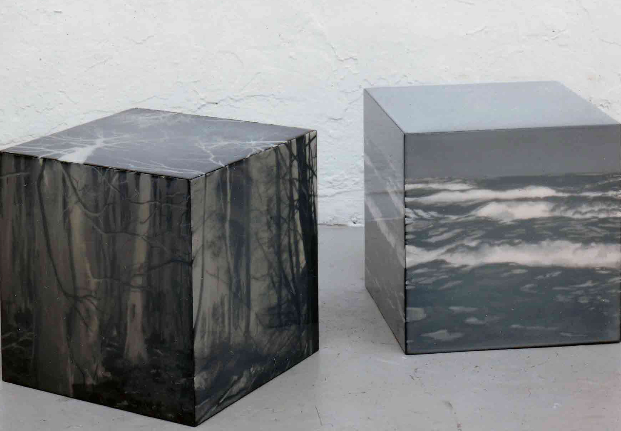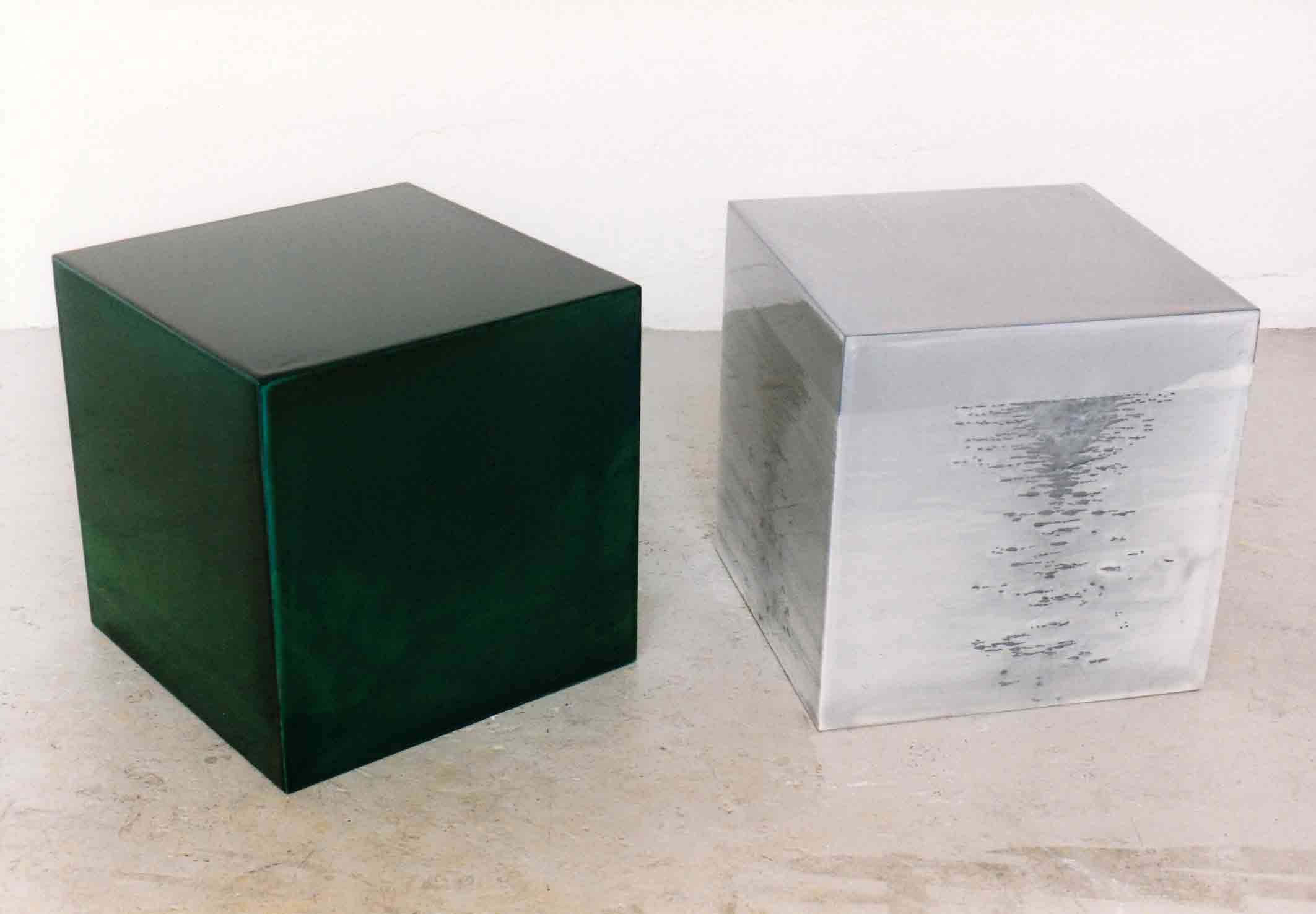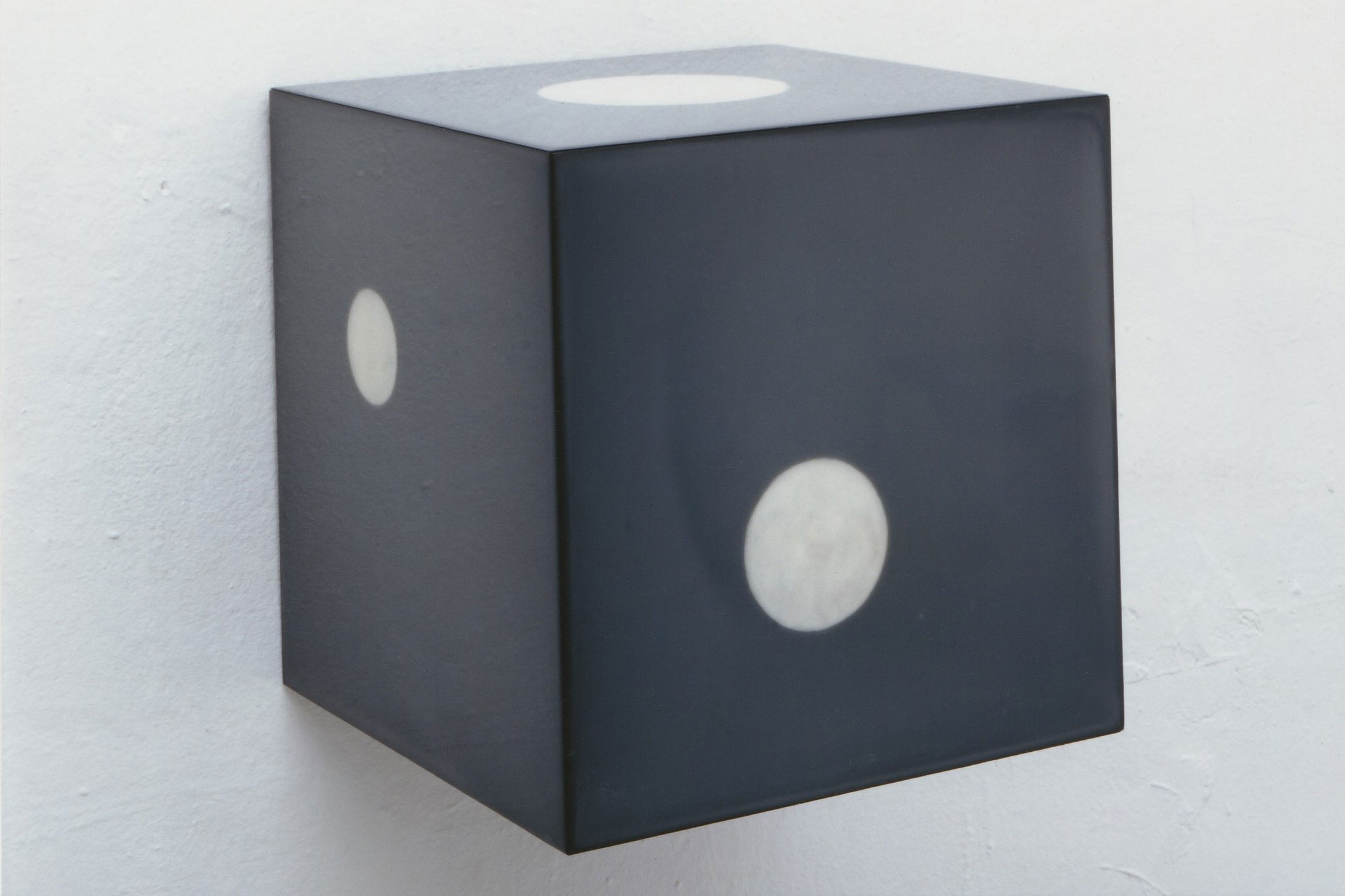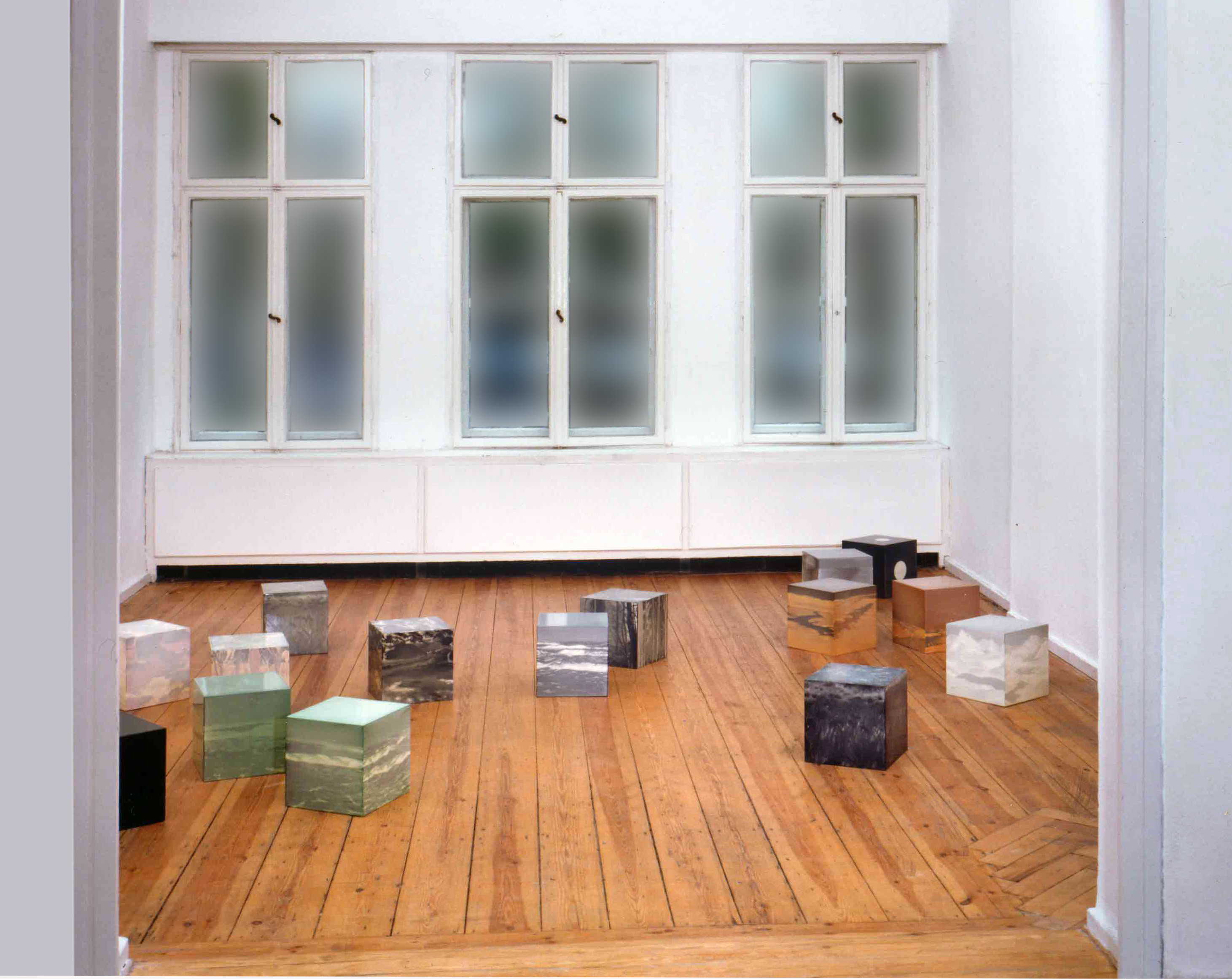 Fünf Bildflächen mit Landschaftsmotiven sind zu einem Würfel montiert. Die Tiefe des gemalten Raumes steht im Gegensatz zur Geschlossenheit und Unzugänglichkeit des Objekts. Es ist umgehbar, aber nicht betretbar. Der Titel verweist auf die Vorstellung einer komprimierten Ausdehnung. Aus der Nähe betrachtet tritt der Körper zurück, und es öffnen sich bildhafte Perspektiven.
