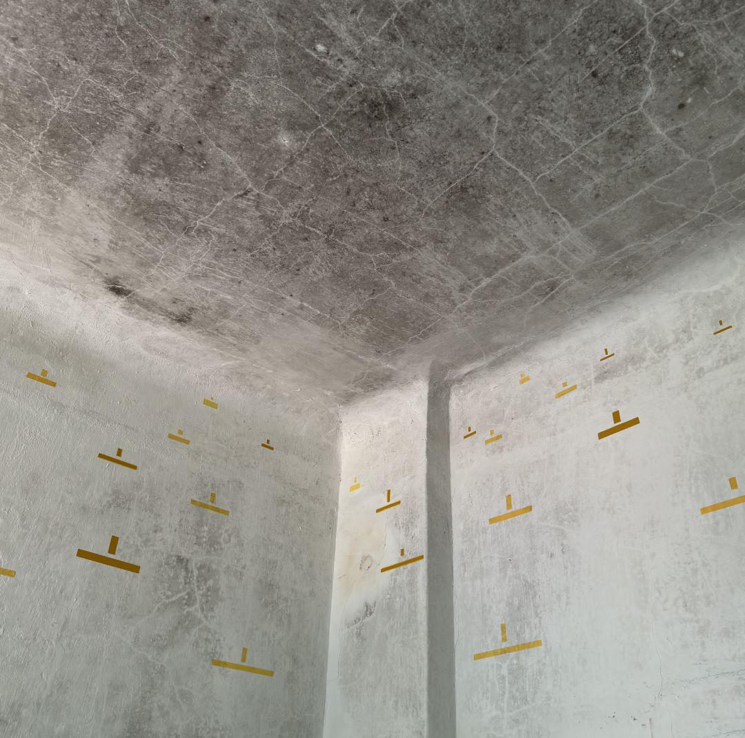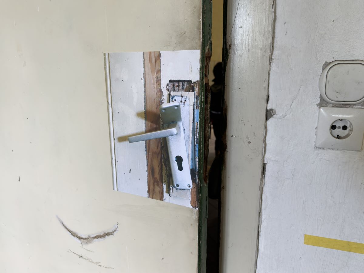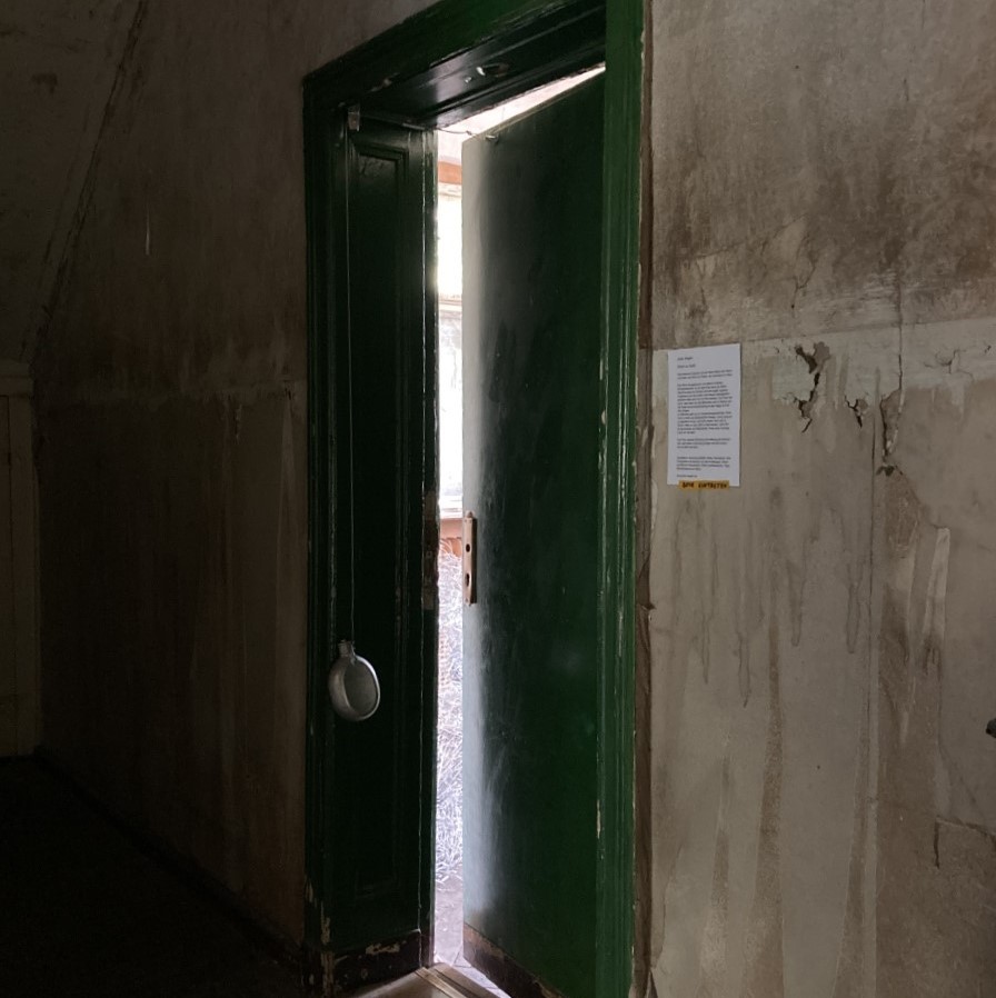 Die Zeichen an der Wand öffnen den Raum und leiten den Blick zur Decke, der schönsten im Haus. Ein Loch in der Mauer und eine ramponierte Klinke zeugen von anderen Lösungsversuchen. Finde einen Ausweg, mach ein Wunder!