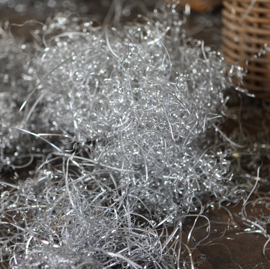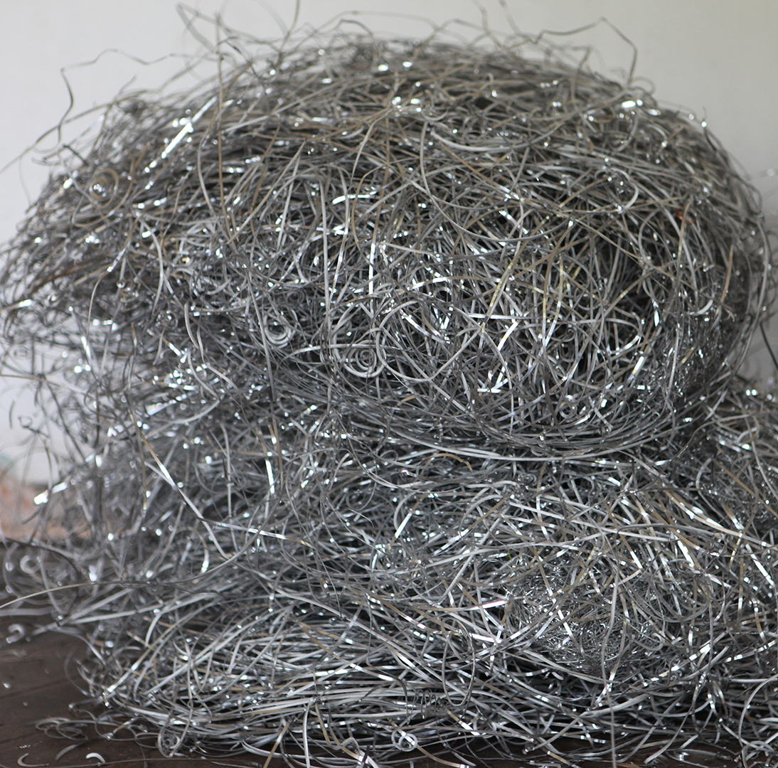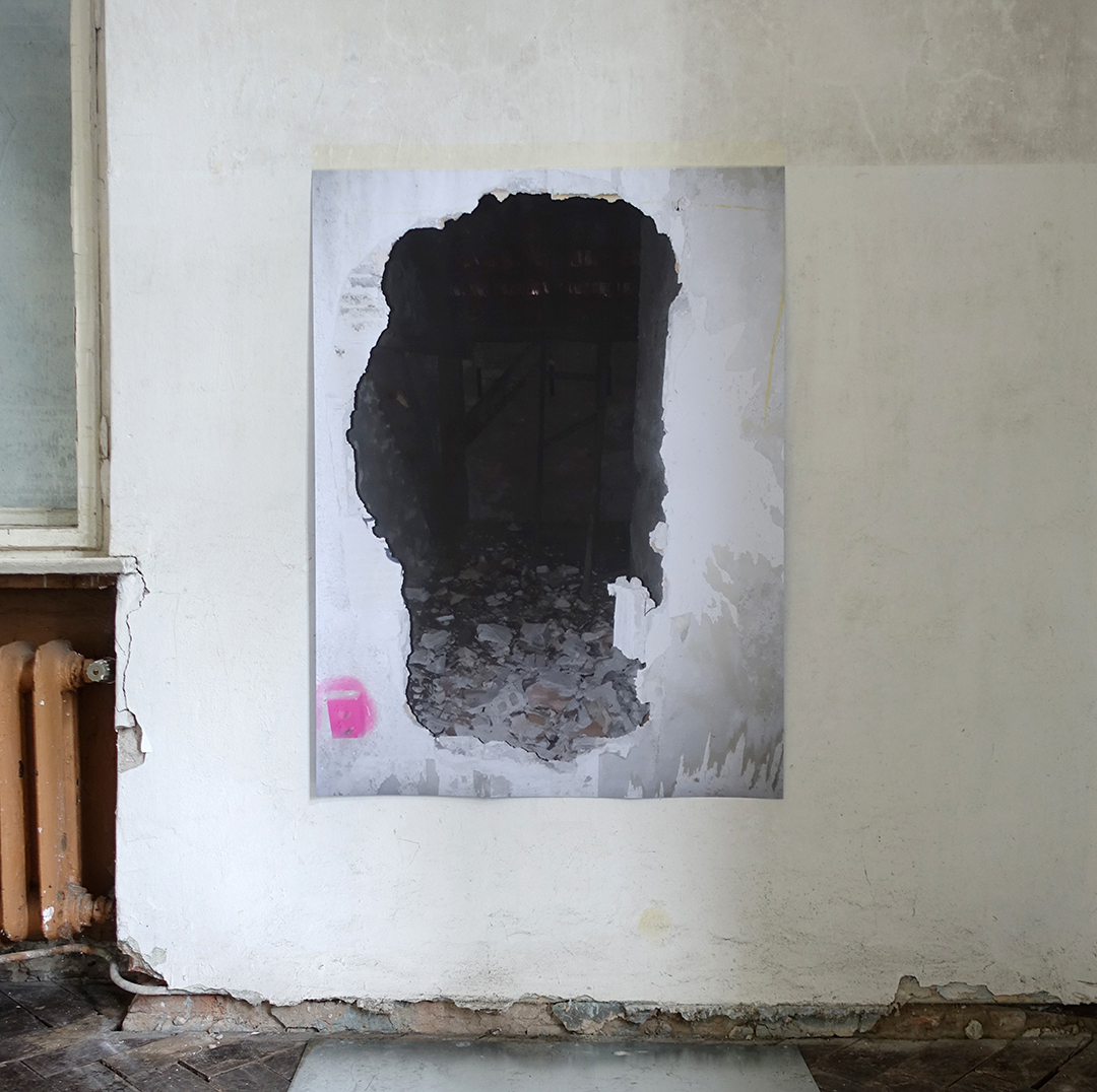 Aluminiumabfälle, Körbe, Fahrradrad, Holz. Fotografien mit Motiven aus dem Schlossgut: Wanddurchbruch (Dachstuhl), Klinke (Außenbereich), Feldflaschen, Tape, Reflektorband auf Wand.