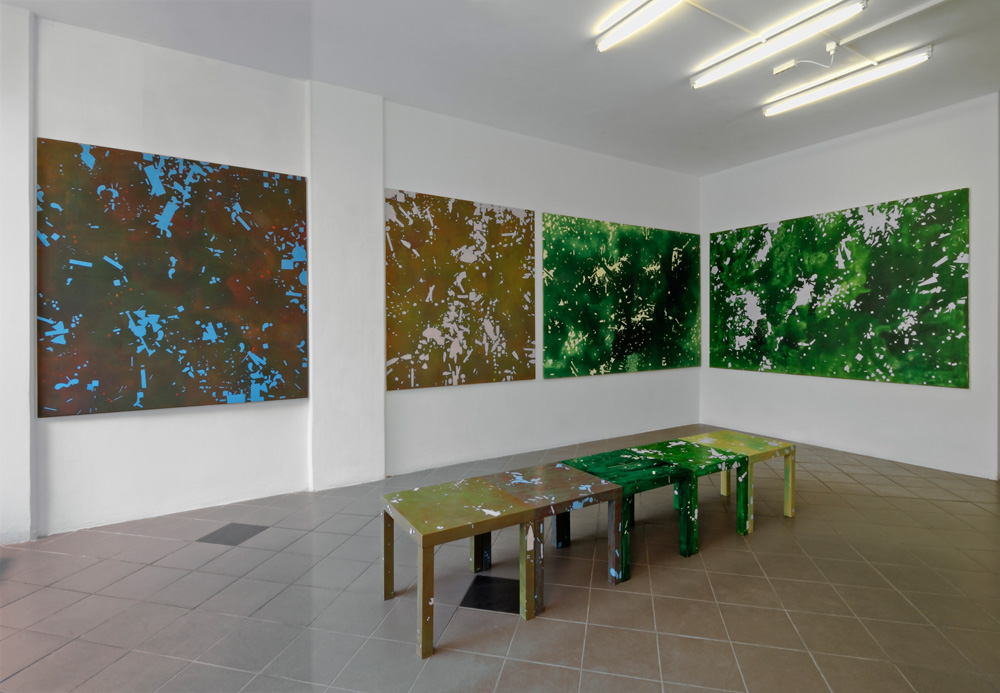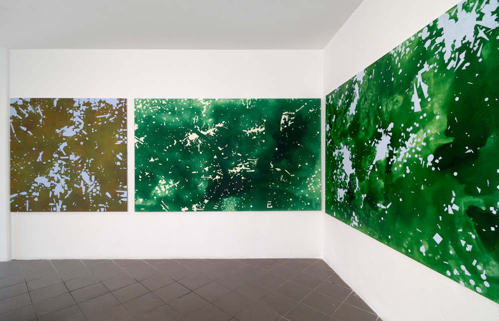 Grüne Hölle, je 170 x 260 cm, Acryl, Lack /Nessel Ausstellungsansicht Point(s) of view, Schloss Biesdorf 2023