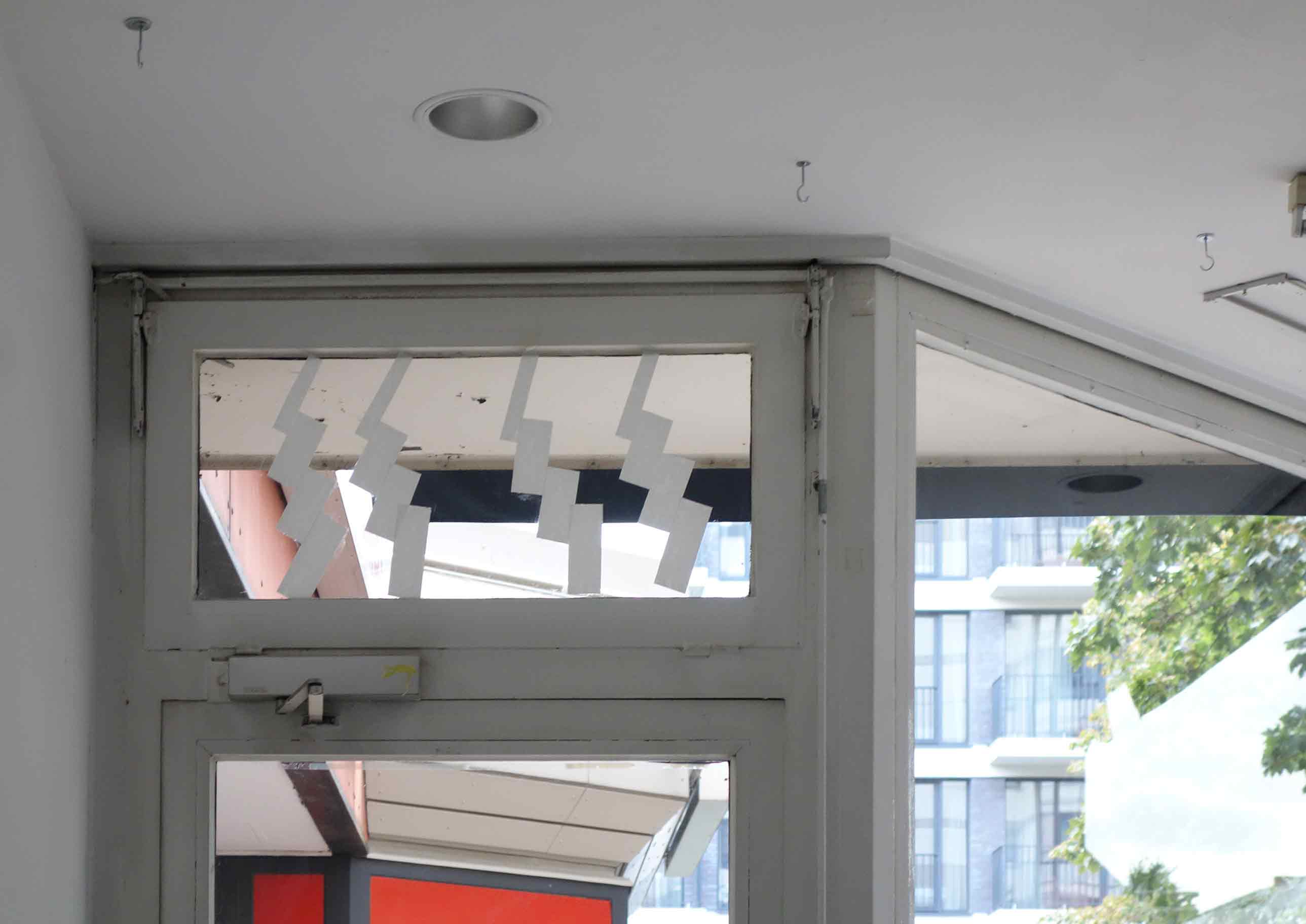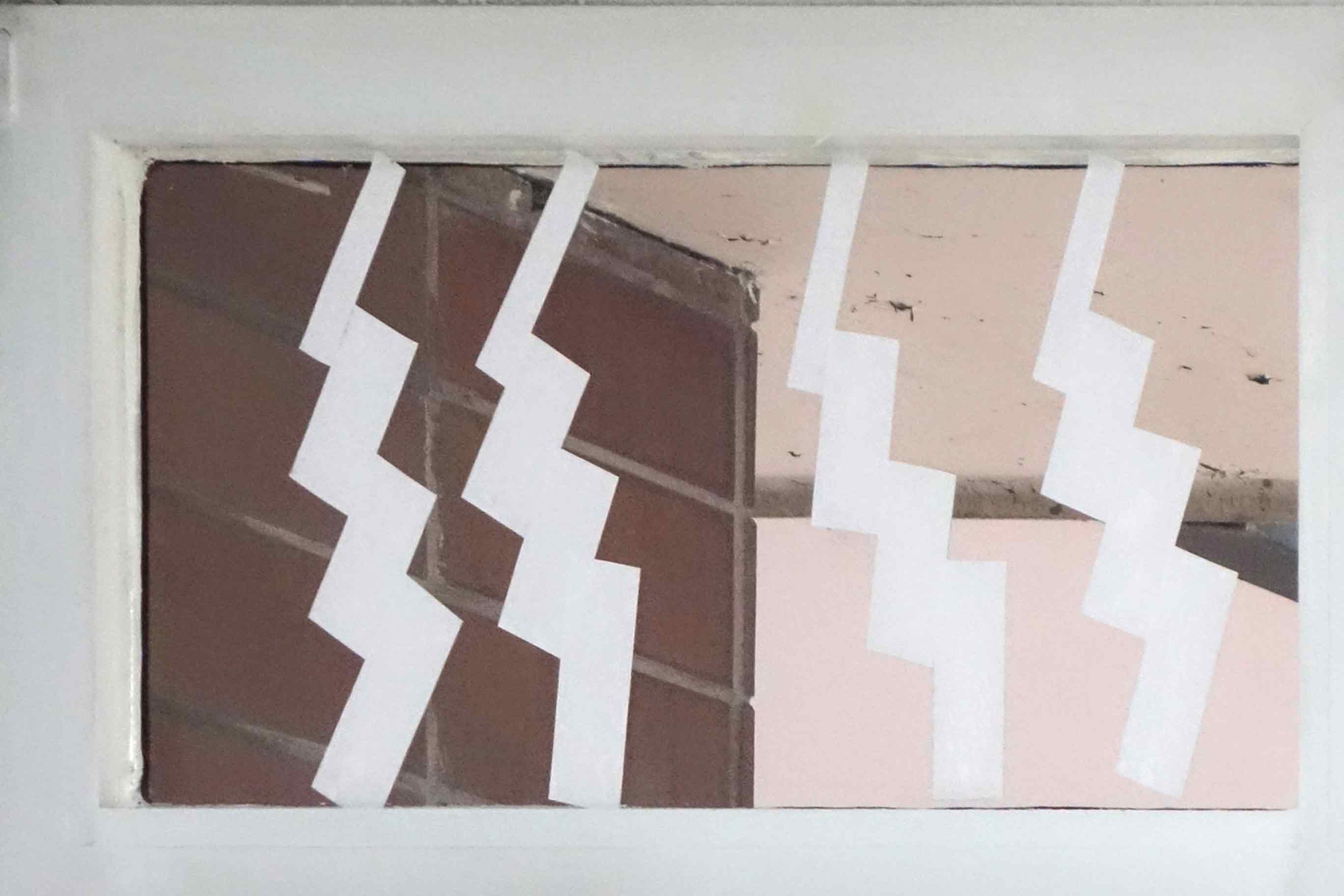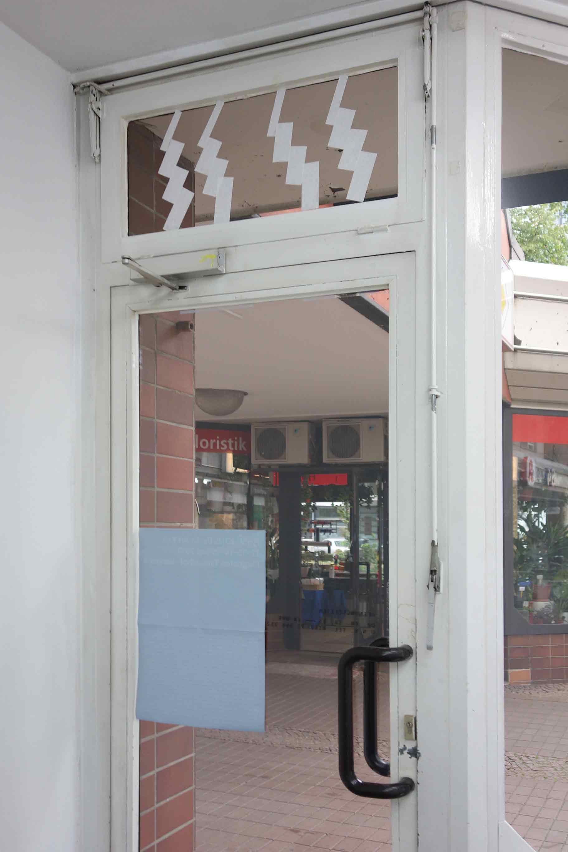 "Shide" heißen im japanischen Shintoismus treppenförmig aus Papier gefaltete Symbole, die den Übergang zwischen materieller und spiritueller Welt bezeichnen. Papierklebeband auf Fensterscheibe im Oberlicht der Eingangstür der Galerie oqbo, Berlin 2019